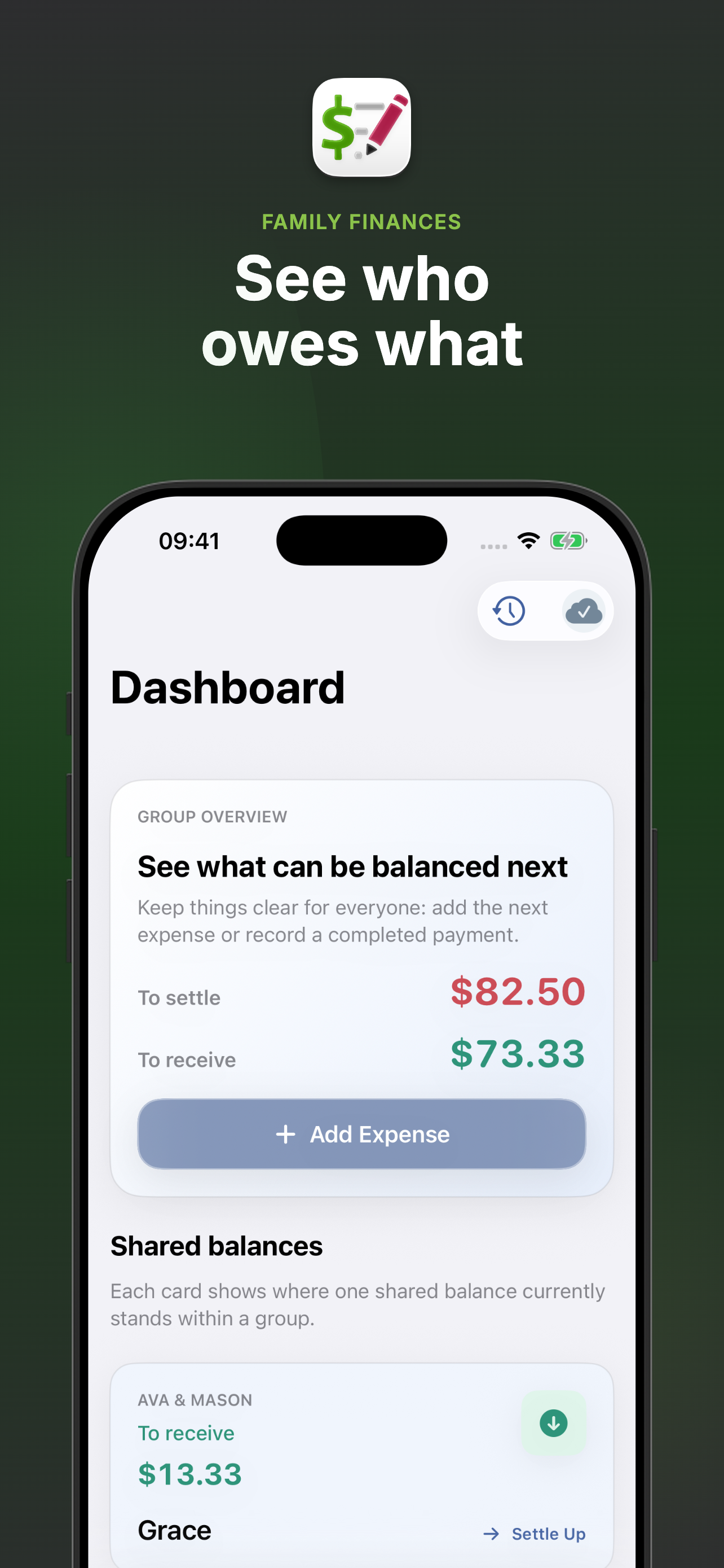 Shared family expenses, clear balances, and fair settlements on iPhone, iPad, and Apple Watch.